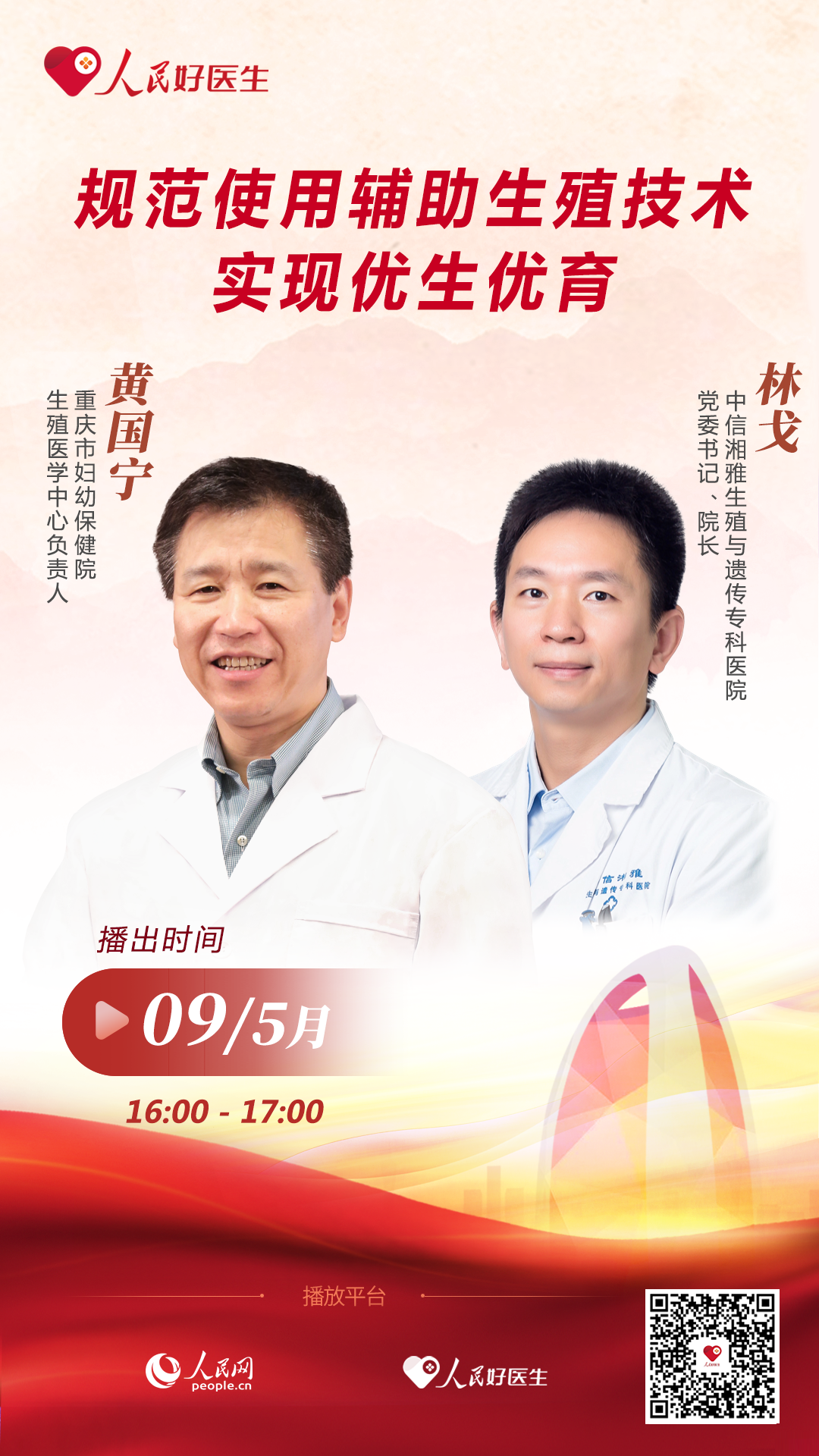 5月9日16:00至17:00,重庆市妇幼保健院生殖医学中心负责人黄国宁,中信湘雅生殖与遗传专科医院党委书记、院长林戈将做客“人民好医生”科普直播间,就辅助生殖技术的发展与应用等问题进行交流,欢迎届时收看。
