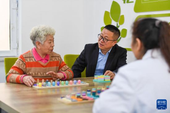 4月24日,在四平市地直街道社区居家养老服务中心,王占野(中)和同事与老人进行益智游戏,预防认知症。新华社记者 张楠 摄