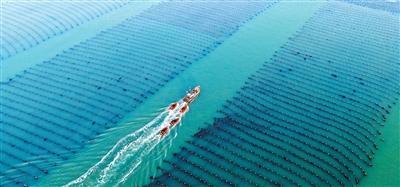 1月27日,山东省荣成市爱伦湾海洋牧场,养殖工人驾驶船只收获小海带,投放各地春节市场。 |